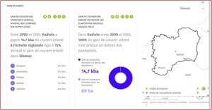 Plus précisément, entre 2000 et 2020, Kadiolo a gagné 14700 ha de couvert arboré à l’échelle régionale, ce qui représente 15% de tout le gain de couvert arboré dans Sikasso. Il est important de noter que 100% de ce gain de couvert arboré s’est produit en dehors des plantations. Les principales localités ayant contribué au gain de couverture forestière dans la région de Sikasso entre 2000 et 2020 sont les suivantes :
