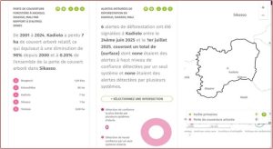 Les données sur la déforestation dans le cercle de Kadiolo proviennent de la plateforme de surveillance des forêts Global Forest Watch, en collaboration avec l’Université du Maryland. Ces chiffres, y compris la perte de 18 800 hectares entre 2000 et 2020, sont calculés à partir de l’analyse d’imagerie satellite et sont disponibles sur le tableau de bord en ligne de Global Forest Watch.