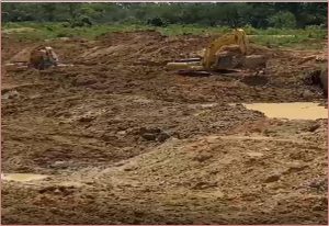 L’image montre une vaste zone de terre excavée et boueuse, typique d’une carrière clandestine d’orpaillage qui utilise des engins lourds. Cette technique détruit la structure du sol et le couvert végétal / Ph:SD