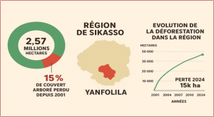 Le changement climatique n’est pas le moteur direct de la déforestation, mais il en aggrave les conséquences. La perte de couvert forestier à Sikasso a généré d’énormes quantités d’émissions de CO₂ (1,60 million de tonnes entre 2001 et 2024 et 4,45 millions de tonnes en 2024) selon Global Forest Watch (GFW), contribuant ainsi au réchauffement climatique et à la dégradation des sols. Ce cercle vicieux rend la régénération de la forêt encore plus difficile et augmente sa vulnérabilité face à des menaces comme les feux de brousse. En l’absence d’arbres, les sols deviennent plus vulnérables à l’érosion et à la désertification, un processus accéléré par l’augmentation des températures et la variabilité des précipitations causées par le changement climatique.