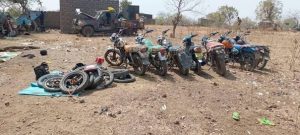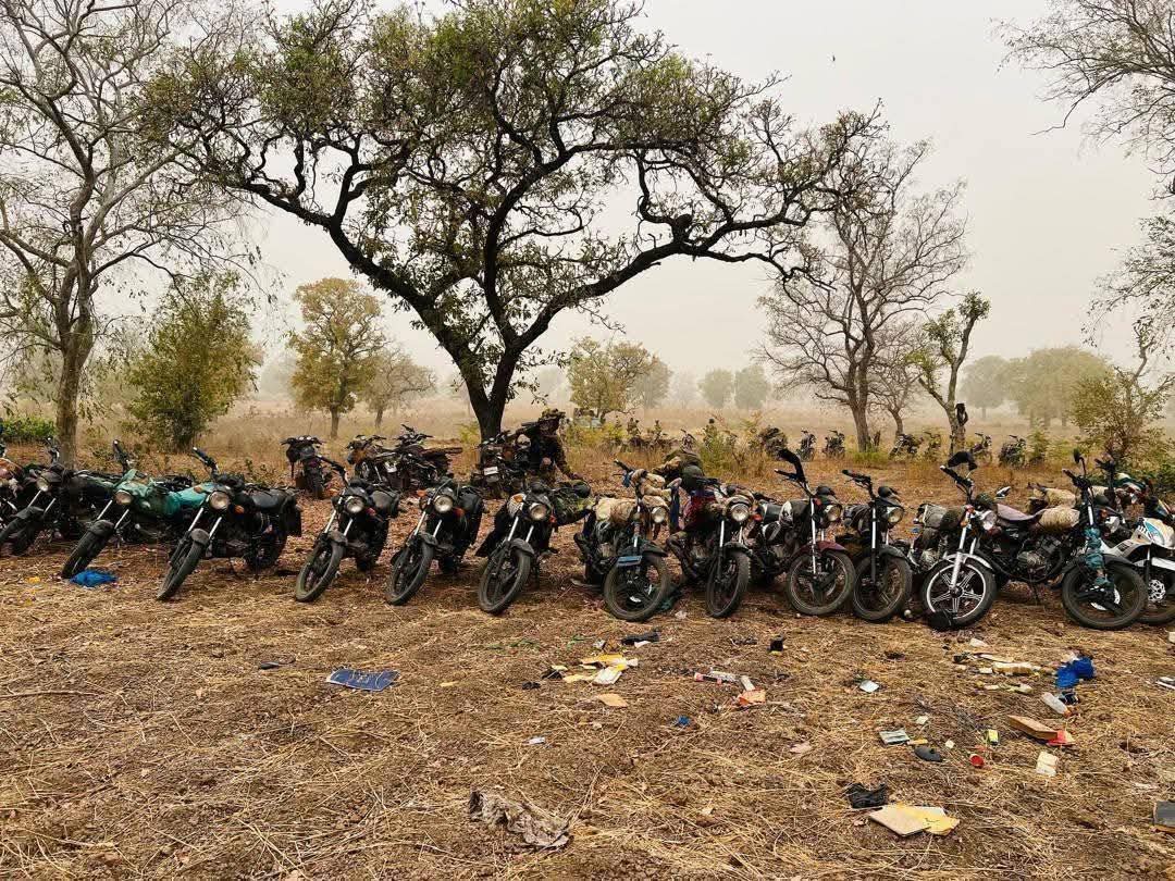 Motos des terroristes trouvées sur une base démantelée par les FDS burkinabè à la frontière avec le Bénin en avril 2025. Source anonyme.