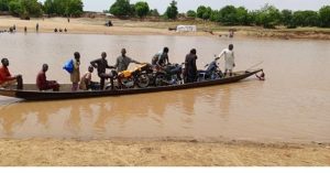 Des passeurs qui font traverser des personnes avec leurs motos sur le fleuve Sota en décrue (l’une des destination clandestine des Naï-Naï et contrebandiers en provenance du Niger ou du Nigéria)